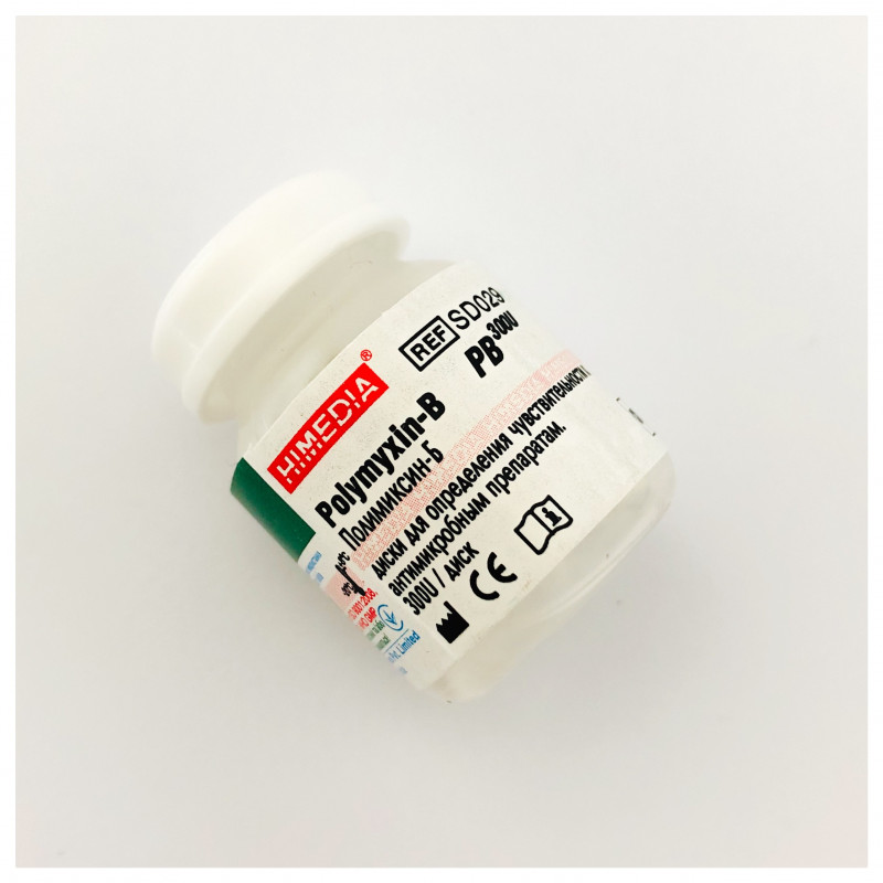 Диски визначення чутливості мікроорганізмів до антимікробних препаратів. Диски SD029 Polymyxin-B / Поліміксин-Бета 300 одиниць. 100 дисків у флаконі.