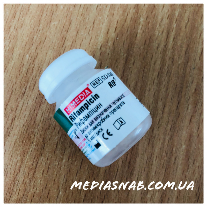 Диски з антибіотиками для визначення чутливості мікроорганізмів до антимікробних препаратів. Диски SD030 Rifampicin / Ріфампіцин 5 мкг. 100 дисків у флаконі.