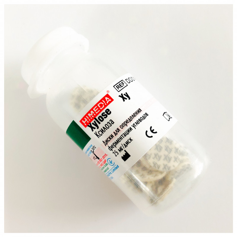 Паперові диски діаметром 10 мм із написом «Xy». Xylose/Диски з ксилозою. 25 штук у флаконі. Використовуються для диференціації бактерій з урахуванням їх ферментації вуглеводів.