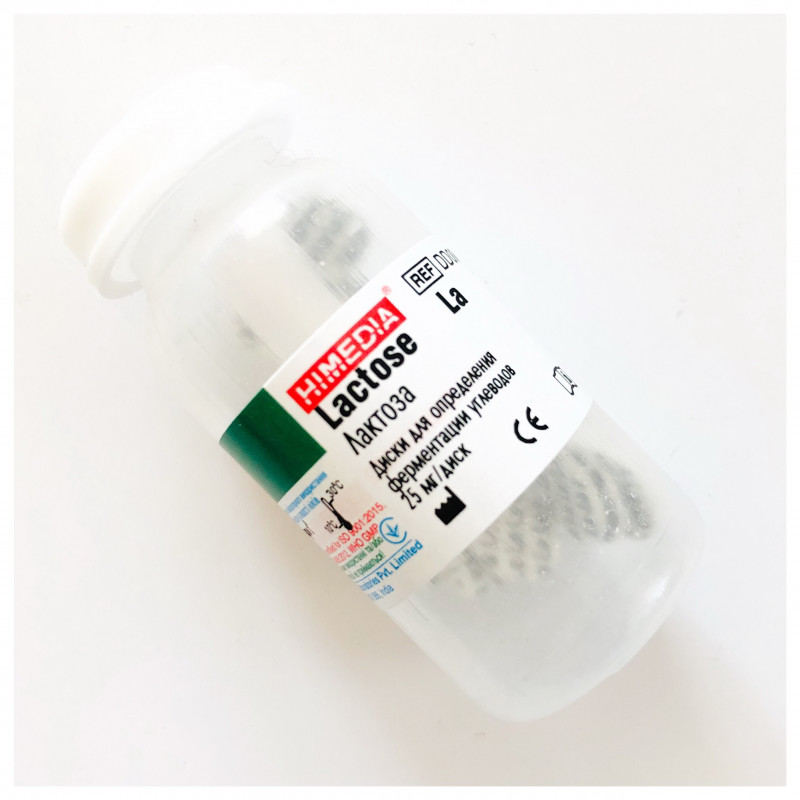 Диски із фільтрувального паперу діаметром 10 мм, з написом «La». Lactose/Лактоза. 25 шт. у флаконі. Використовуються визначення ферментації вуглеводів.